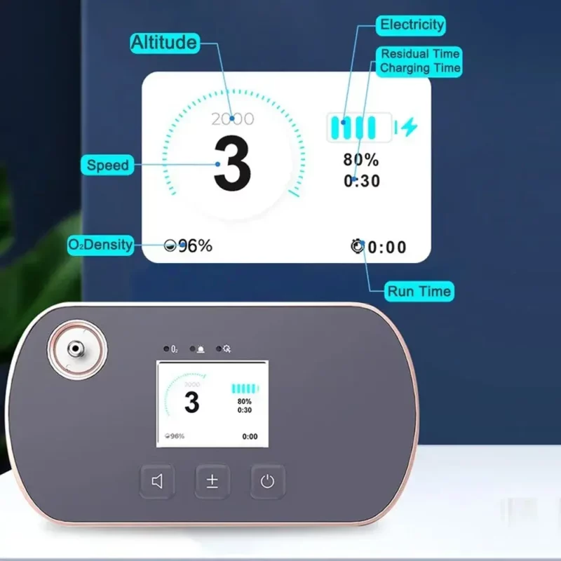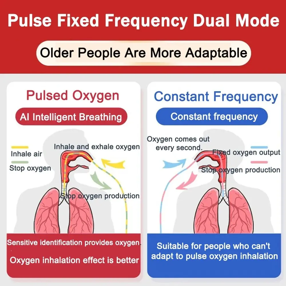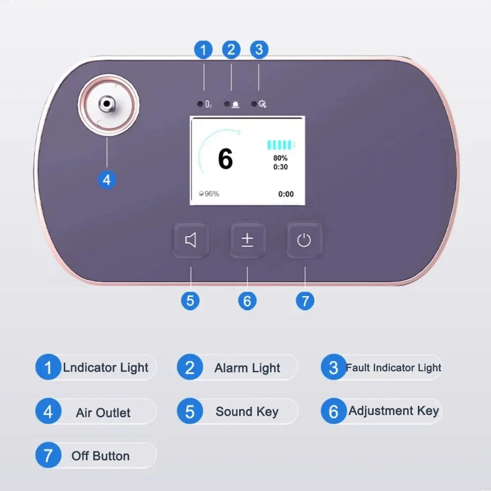 Dieser tragbare 5-Liter-Sauerstoffkonzentrator für die Reise ist mit einer intelligenten Echtzeitüberwachung ausgestattet, einschließlich Sauerstoffabgabe (bis zu 96%), Höhenanzeige, Timerfunktionen und einem 2-Zoll-Bildschirm, der Atemfrequenz (10-40 BPM), Batteriestand und Sauerstofffluss anzeigt. Das Gerät unterstützt sowohl Puls- als auch feste Abgabemodi und passt die Sauerstoffabgabe mithilfe der fortschrittlichen AI-DOSE-Technologie an den Atemrhythmus an. Sein intelligentes Batteriemanagementsystem "K-Bat" sorgt für eine lange, effiziente Nutzung.