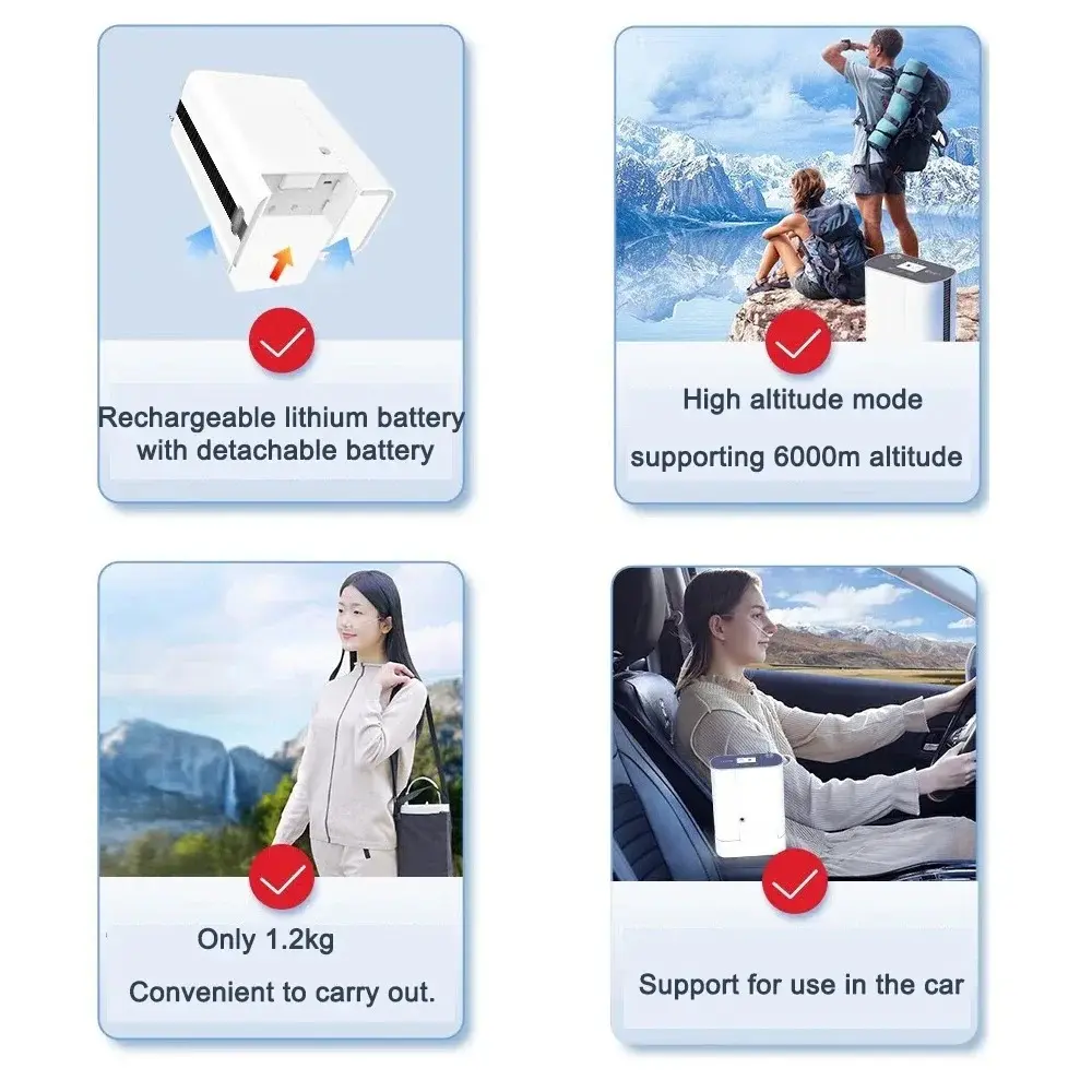 Da er bis zu einer Höhe von 6000 Metern über dem Meeresspiegel betrieben werden kann, ist er der ideale Begleiter für Bergtouren oder Flüge. Dieser tragbare Sauerstoffkonzentrator für die Reise verfügt über eine abnehmbare, wiederaufladbare Lithiumbatterie, ein Autoladegerät (12 V Gleichstrom) und einen Wechselstromanschluss (110-240 V) und deckt damit alle Nutzungsszenarien ab. Trotz seines geringen Gewichts bietet er medizinische Leistung mit geringem Geräuschpegel und langer Lebensdauer und ist somit für den ganztägigen Gebrauch geeignet.