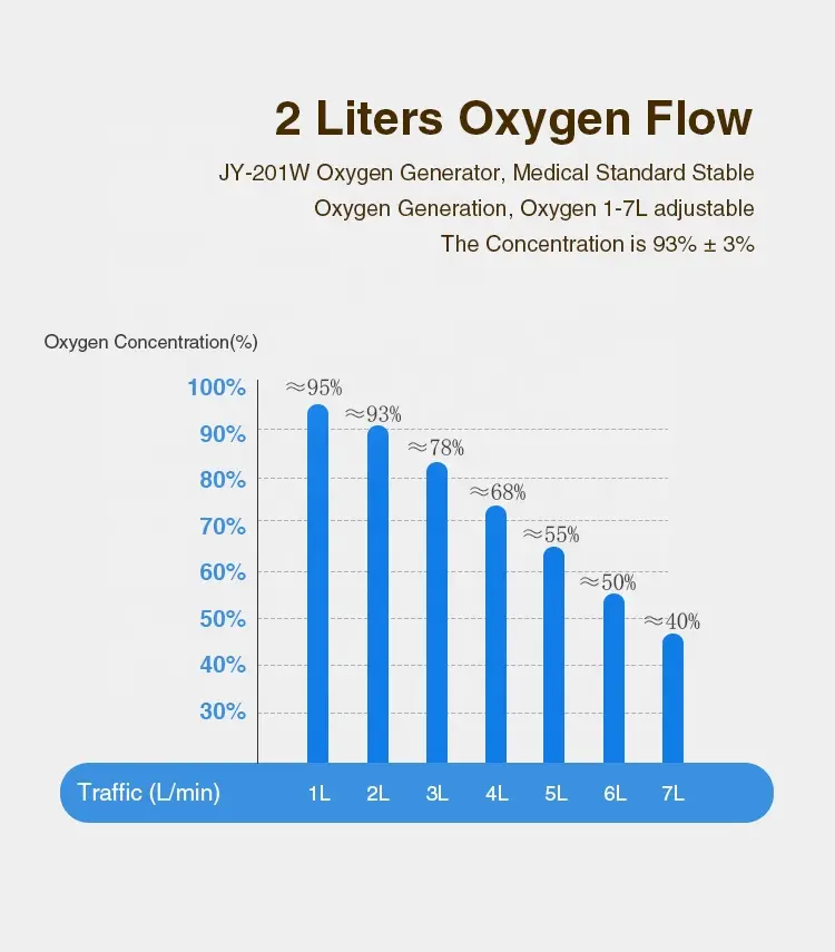 Le concentrateur d'oxygène haute pureté YK-201N 7L fournit de l'oxygène en continu avec des réglages de débit de 1 à 7L. Il offre une pureté allant jusqu'à 93%±3 à 1L, mais la concentration diminue progressivement à 7L. des niveaux de débit plus élevés - atteignant environ 45% à 7L. Il est donc idéal pour une utilisation flexible à domicile, en particulier pour les utilisateurs qui ont besoin d'une assistance modérée en oxygène dans un appareil léger de 6,5 kg.