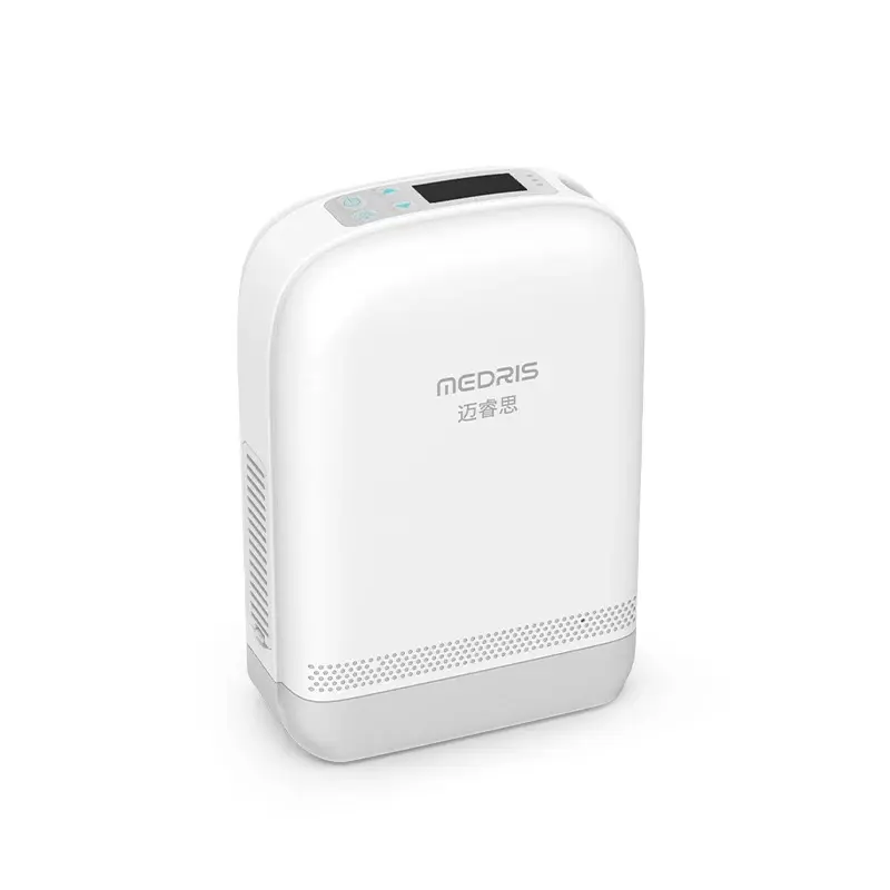 Le MEDRIS M-5A est un concentrateur d'oxygène portable qui prélève l'air ambiant, filtre l'azote, et délivre de l'oxygène concentré (jusqu'à 93%) à l'utilisateur par l'intermédiaire d'une canule nasale.