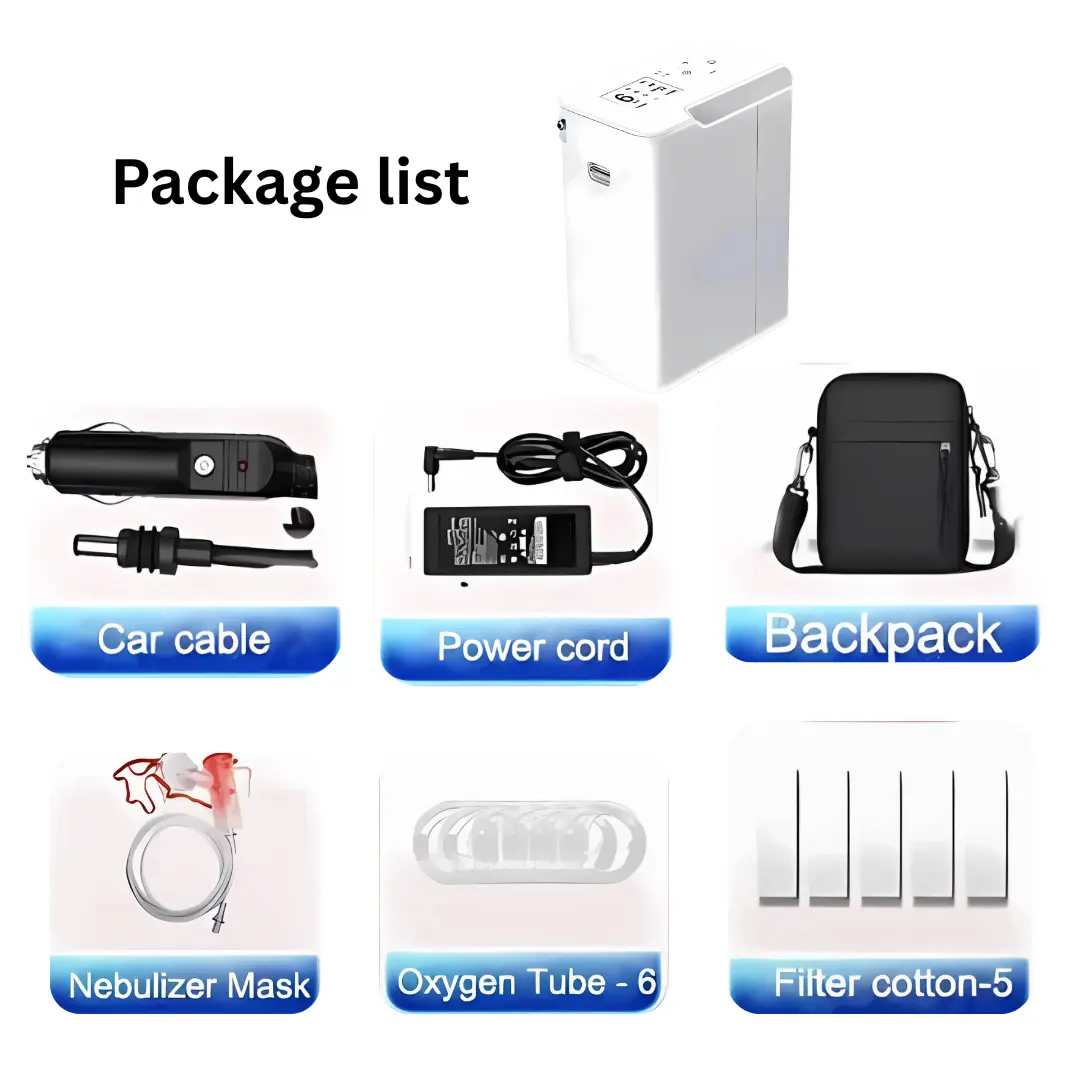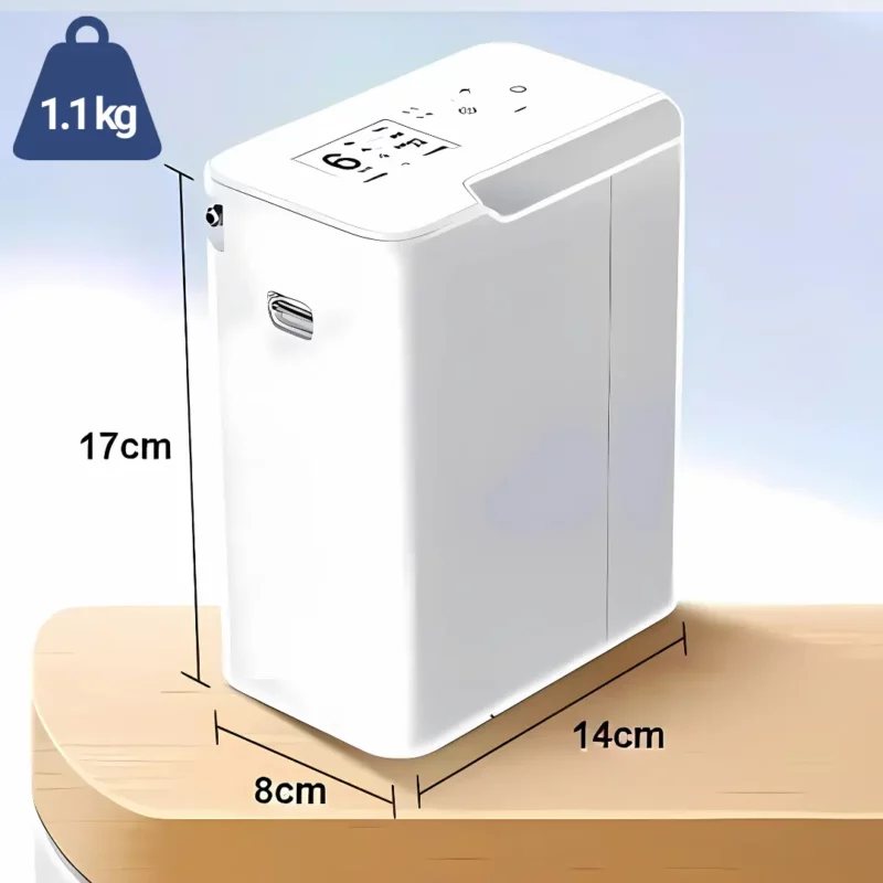 Respirez proprement et restez mobile grâce à l'oxygène de qualité médicale 96% et à la thérapie d'atomisation 9L dans un seul appareil compact de 1,1 kg. Parfait pour une utilisation à la maison ou en voiture.
