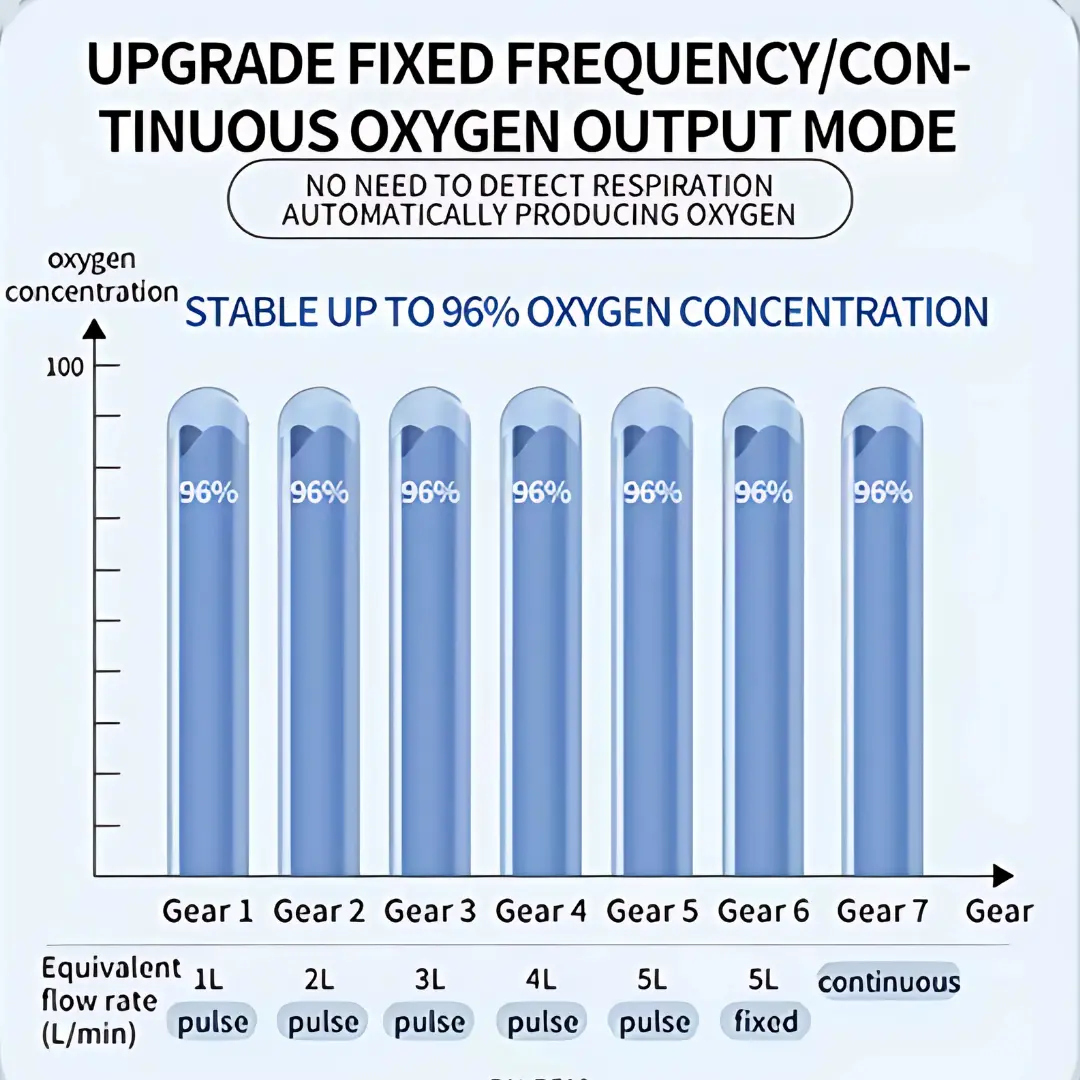 Mode continu : Administration régulière d'oxygène, idéale pour le sommeil ou les respirations irrégulières.