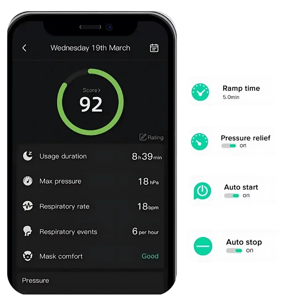 - Grâce à des temps de rampe personnalisables, à l'allègement de la pression et au suivi des événements, vous contrôlez totalement votre expérience du sommeil, avec des informations basées sur des données pour un meilleur repos.
