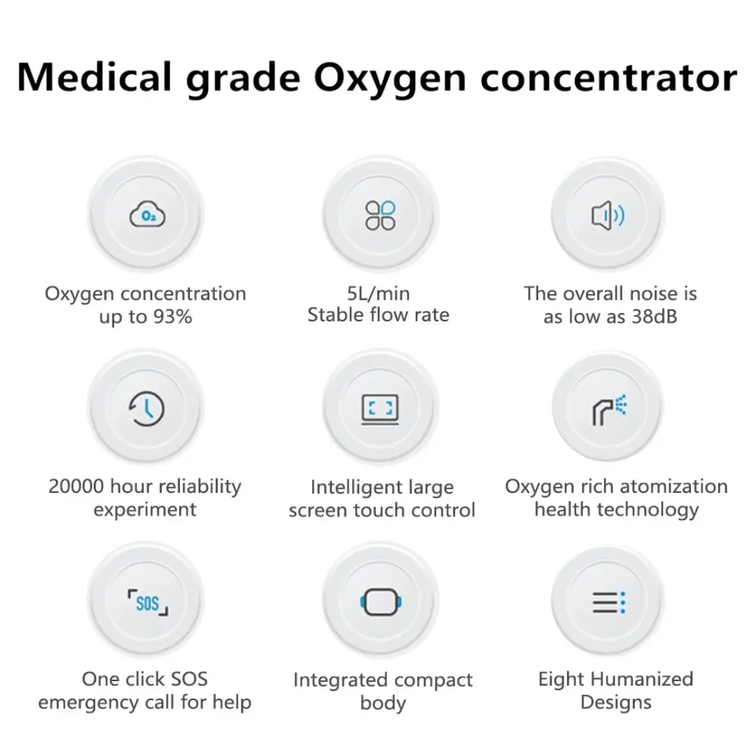 Questo concentratore di ossigeno combina prestazioni di livello medico con controlli di facile utilizzo. È dotato di portate regolabili da 1 L a 5 L al minuto, di un'uscita per la purificazione degli anioni e di una modalità di nebulizzazione (nebulizzatore) integrata per un ulteriore supporto respiratorio. Costruito con un funzionamento efficiente dal punto di vista energetico e con una capacità di lavoro continuo per 24 ore, offre un'ossigenoterapia affidabile con un rumore minimo.
