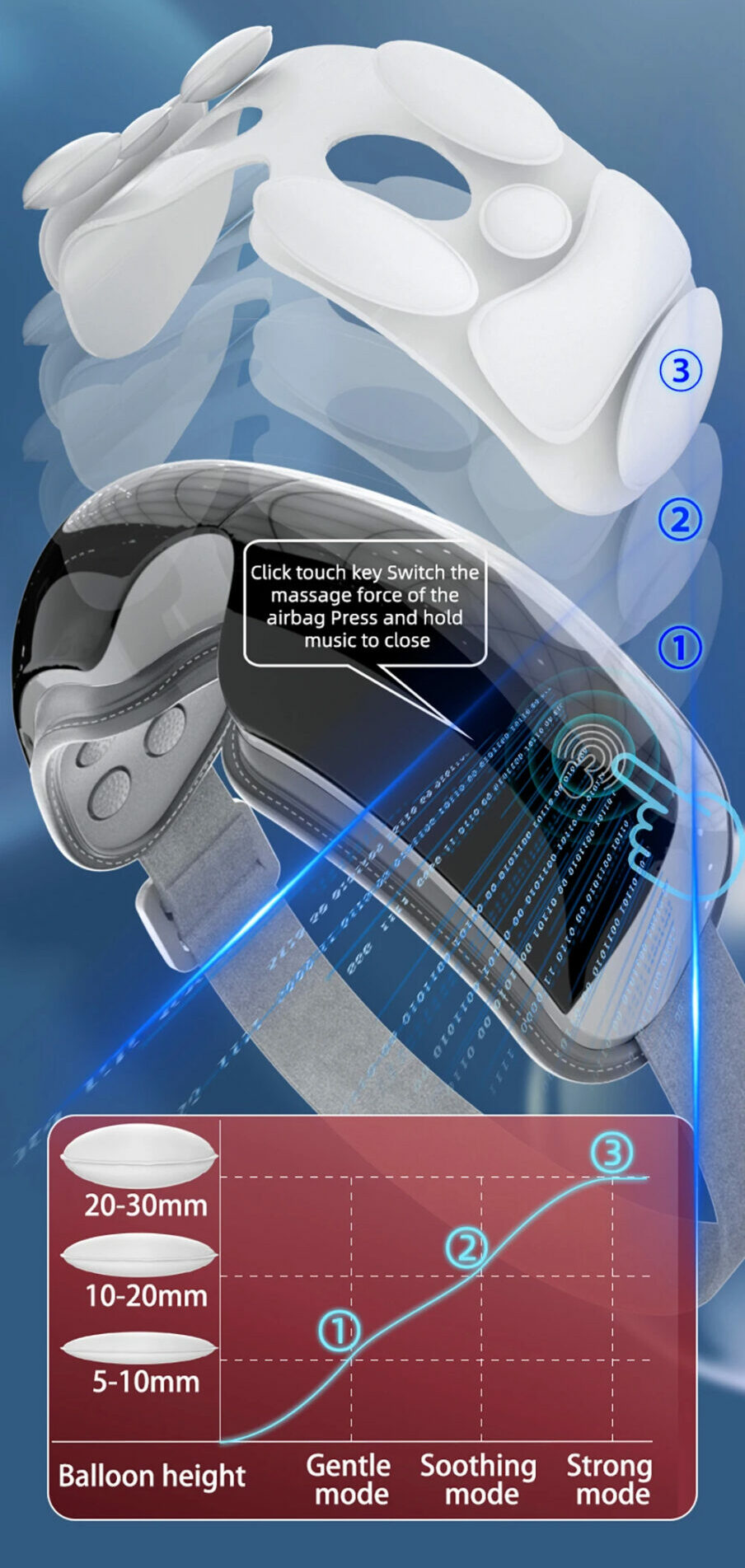 Third gear (strong, soothing, gentle) airbag height adjustment Intelligent matching of different face shapes, to meet the intensity requirements of different eye massage
