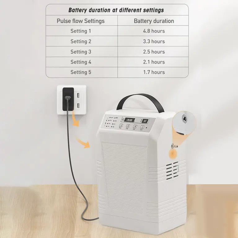 The JY-P05A portable oxygen concentrator battery provides up to 4.8 hours on setting 1. Recharge fully in just 2–3 hours with either the AC adapter or car charger.