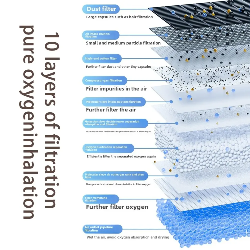 Designed for compact portability and medical-grade performance, the device features a 10-layer filtration system, including a French-imported CECA lithium molecular sieve, ensuring clean, breathable oxygen. Its silent motor provides low-noise operation, while smart pulse/active oxygen modes optimize delivery. A water cup oxygen function and microfine compressor enhance therapy quality.